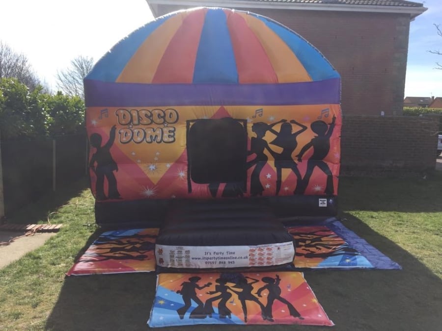 The disco dome bouncy castle is a great inflatable that is always very popular. It comes with built in speaker and disco lights. You can either put songs on via Bluetooth or our ready made great USB, and dance the night away on the bouncy floor. It is suitable for adults and children.
